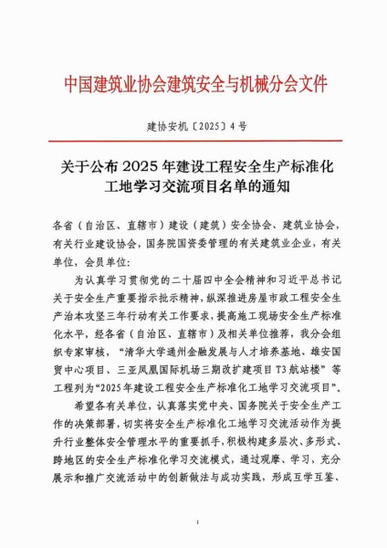 该评选旨在深入贯彻落实党中央、国务院关于安全生产工作的决策部署,提升建筑施工现场安全生产标准化水平。经各地建设安全协会及相关单位推荐,中国建筑业协会建筑安全与机械分会组织专家严格评审,最终遴选出一批在安全生产标准化方面具有示范引领作用的优秀项目。