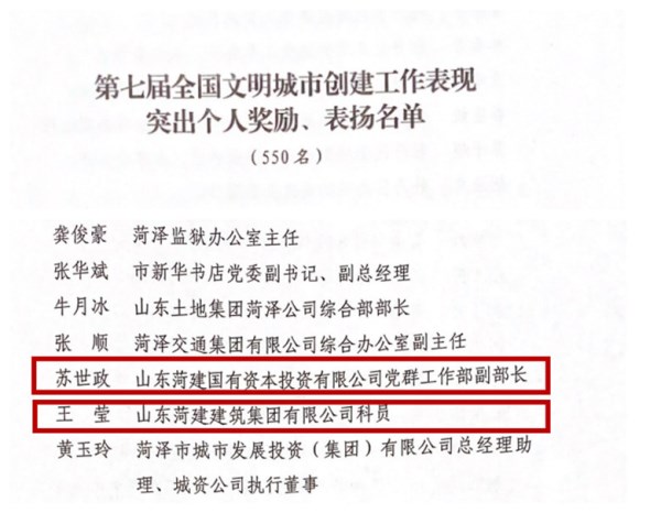 10月13日,菏泽市精神文明建设工作会议召开,对全国文明城市创建过程中涌现的先进集体与个人进行集中表彰。菏建国投公司凭借扎实有力的创城举措与显著成效,获评“第七届全国文明城市创建工作表现突出集体”;菏建国投职工苏世政、菏建集团职工王莹因在创城一线的积极作为与无私奉献,荣获“第七届全国文明城市创建工作表现突出个人”称号。