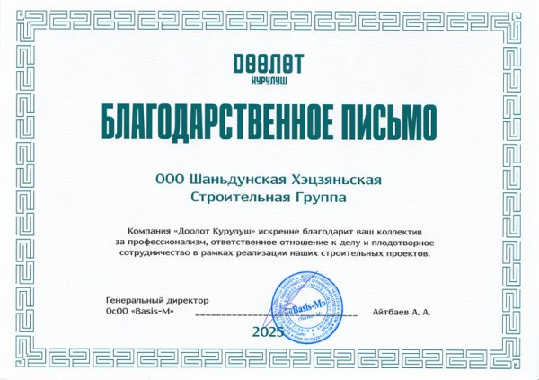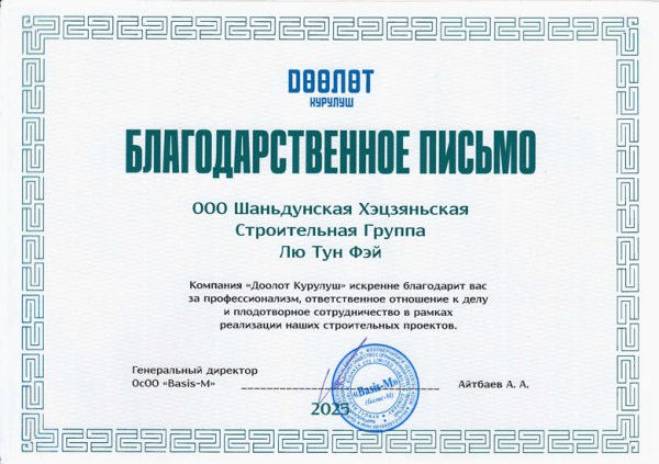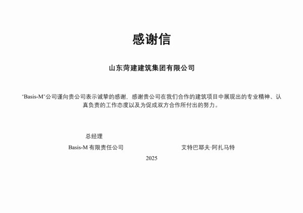 近日,吉尔吉斯斯坦Basis-M有限责任公司向山东菏建建筑集团有限公司及公司职工刘同飞同志正式致送感谢信,对其双方在建筑合作项目中表现出的专业精神、高度负责的态度及卓有成效的协作表示高度赞扬与诚挚感谢。